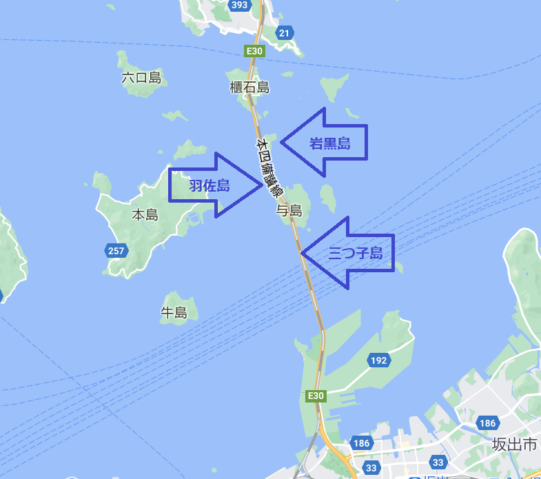 地図を見ると瀬戸大橋は5つの島の上を通っています。