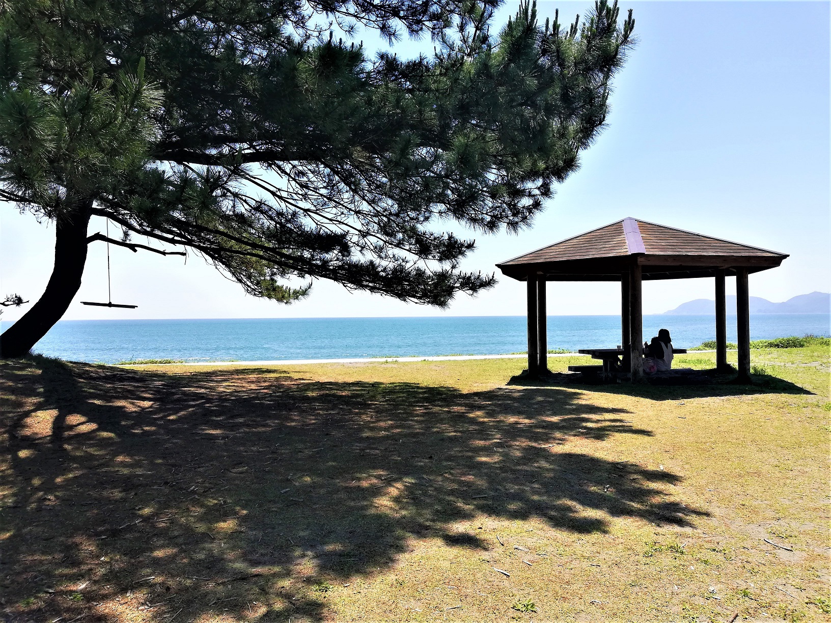 海の方に歩いていくと、東屋でおかあさんとお子さんがお弁当を食べています。