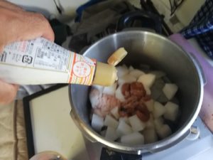圧力鍋に、ホルモンとこんにゃく、長ネギ、