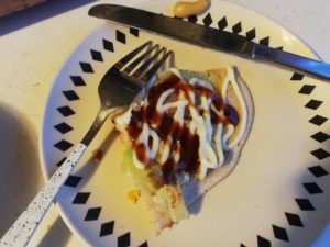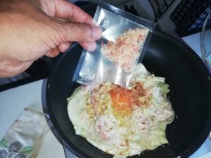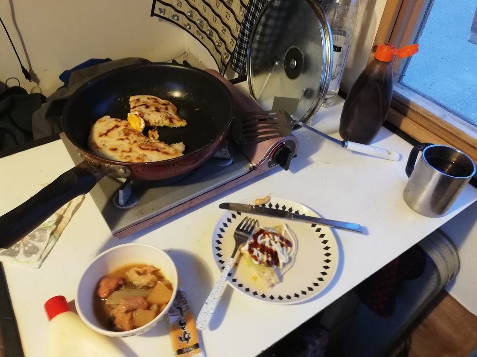 先日やった手巻き寿司と、このお好み焼きを定期的に加えれば、あの365日フライパン料理しかなかった旅の食生活が飛躍的に進歩するのは間違いないでしょう。