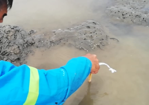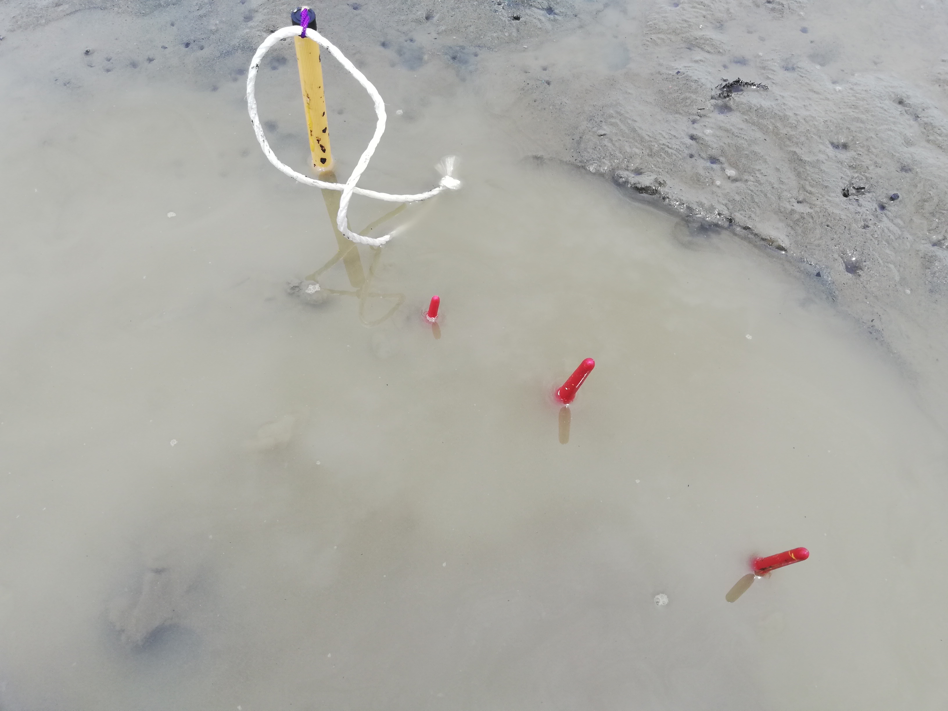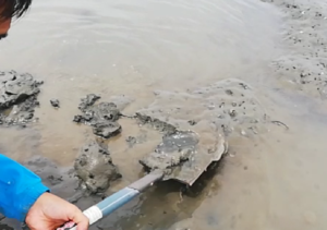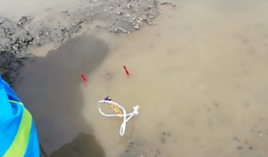 水が濁って穴がわからんぞ。