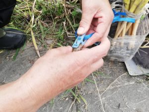 まずは筆で捕ったシャクの尻尾に、紐の着いた洗濯ばさみでシャクの尻尾を挟んで穴の中にいれると