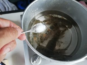 ホントは油で揚げたいのですが、油がないので塩茹でにします。