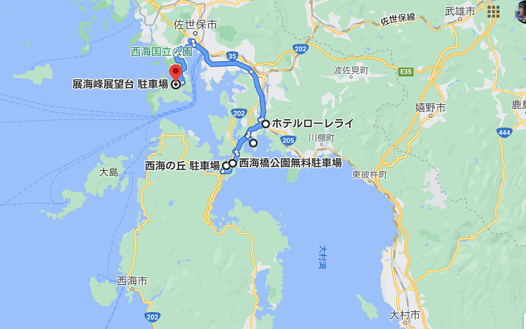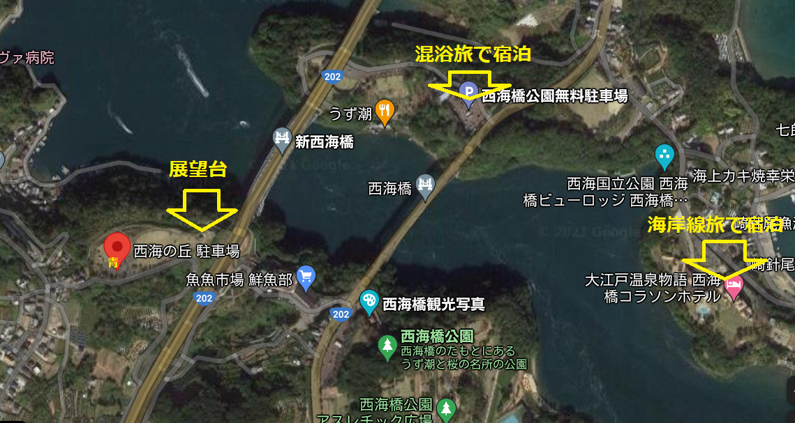 この辺りは3回目の訪問になるのですが、混浴旅の時には左上の西海橋公園に泊まり、海岸線旅の時には北区の人妻と右上のコラソンホテルに泊まったのです。