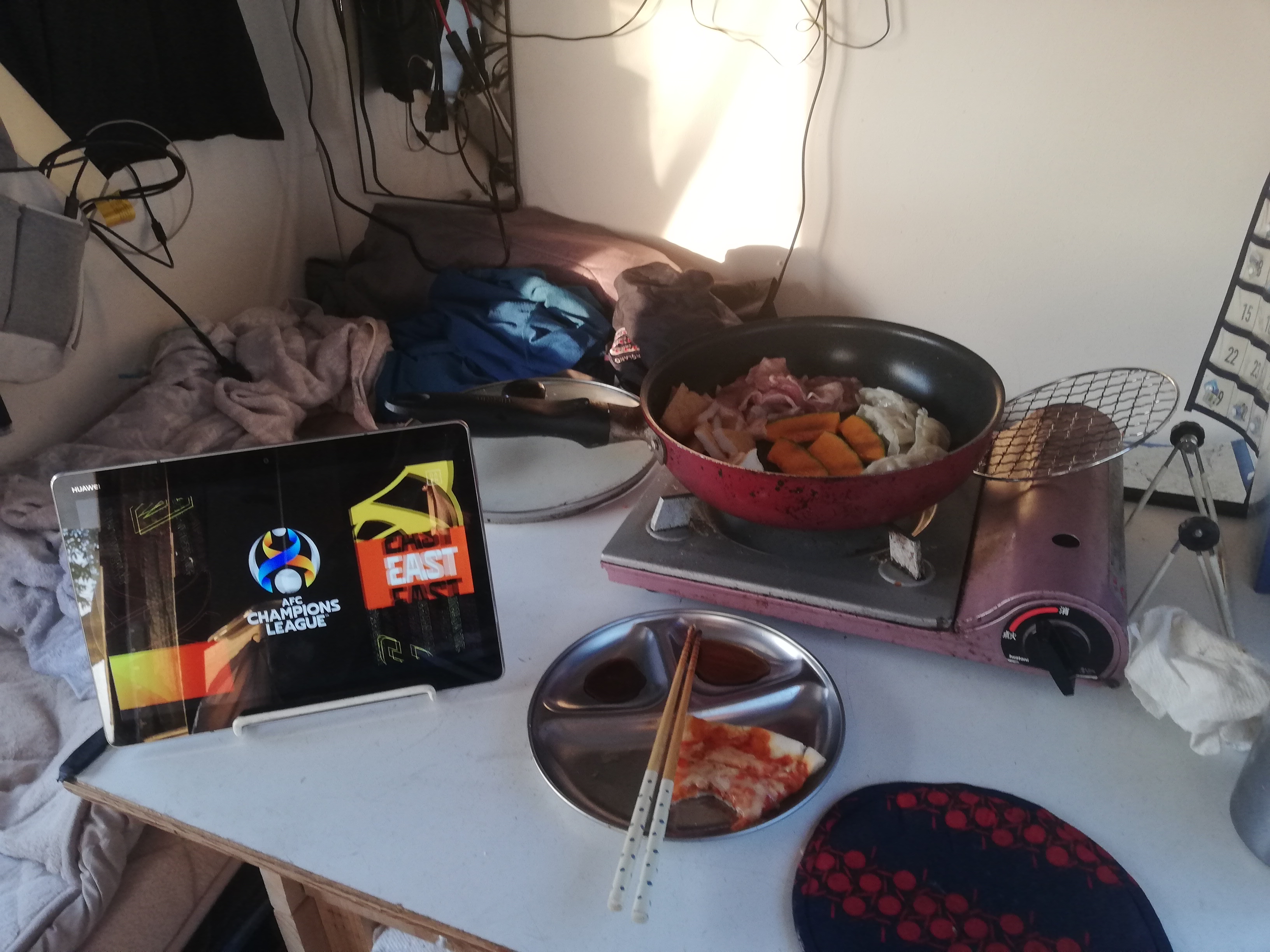 夕日が差し込む中、ACL(アジアチャンピオンズリーグ)のゲームを観ながら夕食です。