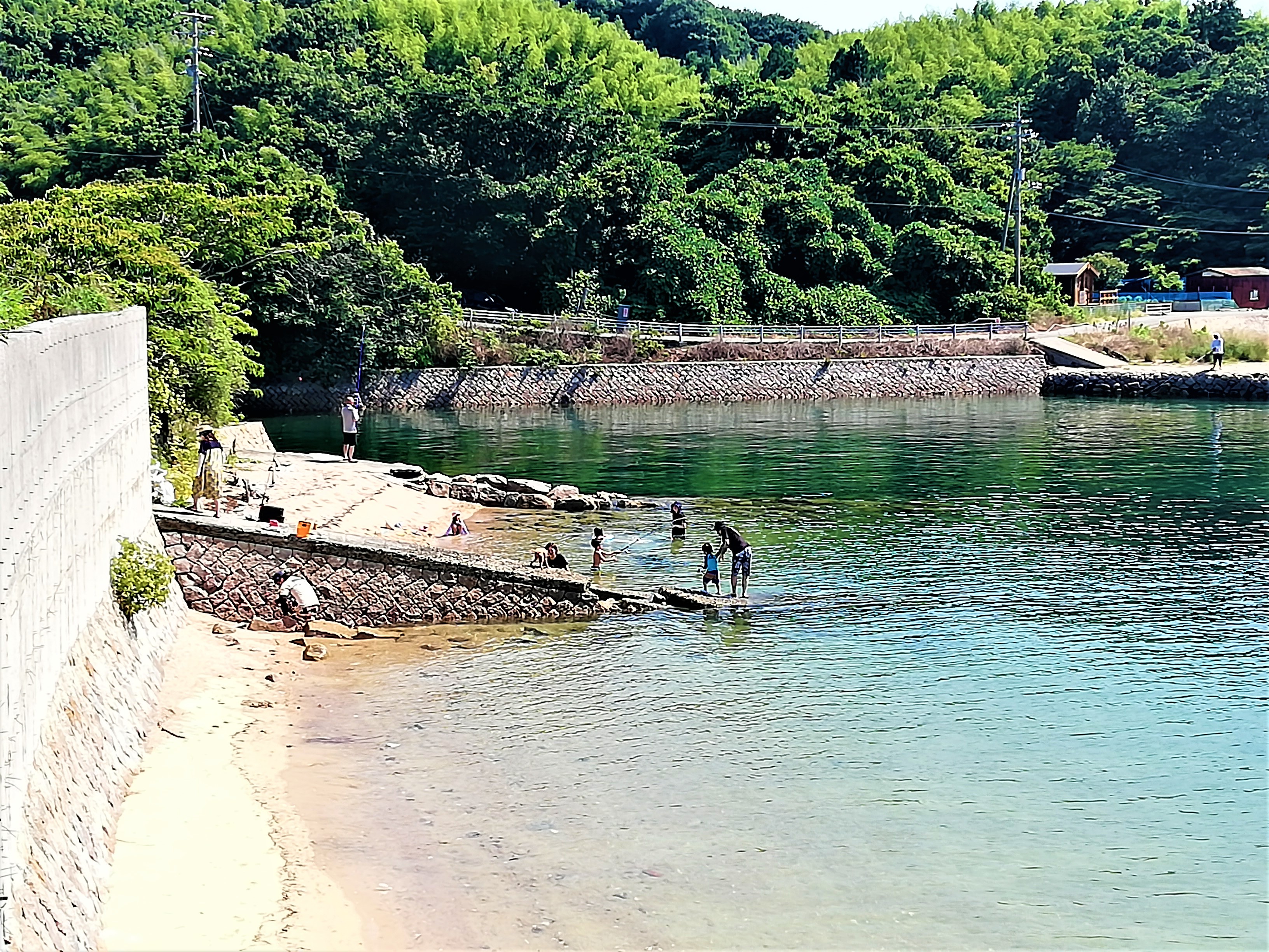 小さなビーチでファミリーが水遊びをしていたりする姿が