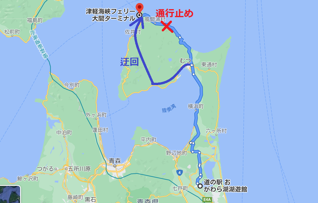 先日の豪雨で大間に向かう途中の橋が崩落して279号線が通行止めになってるようです。