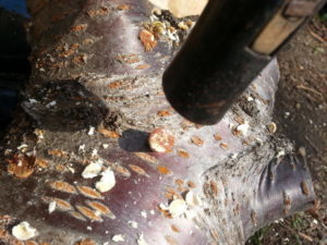 予定では右側のウッドデッキ側に倒すはずだった木が、どういうわけか家の方に傾き出したのです。