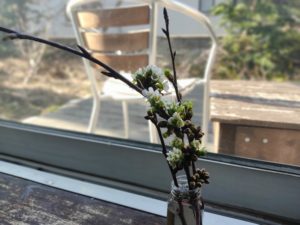 庭の桜の木の枝を切ったあと、妻がパブロンゴールドの瓶に…差していた枝に花が咲いてきました。