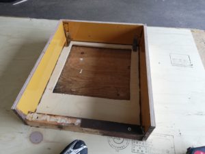 丸鋸でパネルを切り出して新たに換気扇カバーを作ります。