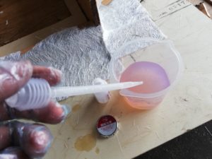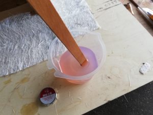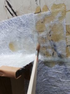 おお、樹脂がガラスマットに浸み込んでいきます。