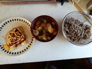 昼飯はたもぎ茸そばと昨夜余ったお好み焼きです。