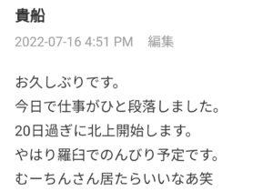 本日、羅臼テント村に寄りましたが、残念ながらむーちんさんは離脱後でした。今夜はひとりさみしく風呂でも入って寝ます。またお会いできればいいなぁ。