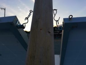 ハシゴを掛けて屋根に上り、ソーラーパネルを立ててフックに掛けます。