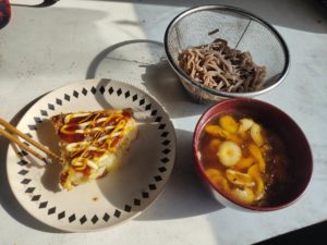 たもぎ茸そばと昨日の残りのお好み焼きです。