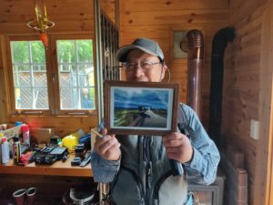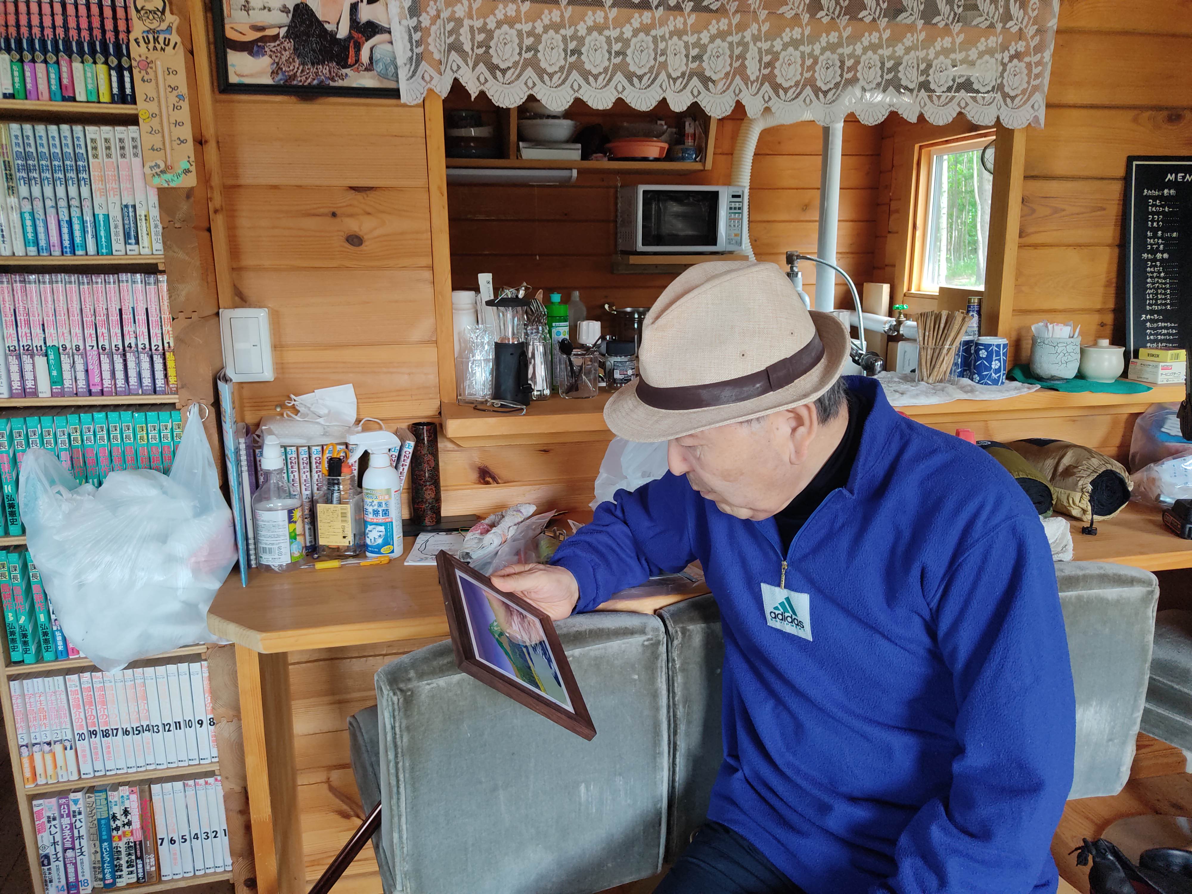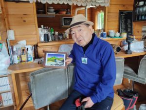 と言ってオーナーに羅臼岳を描いた「真夏の知床越え」の絵をお見せしたのです。