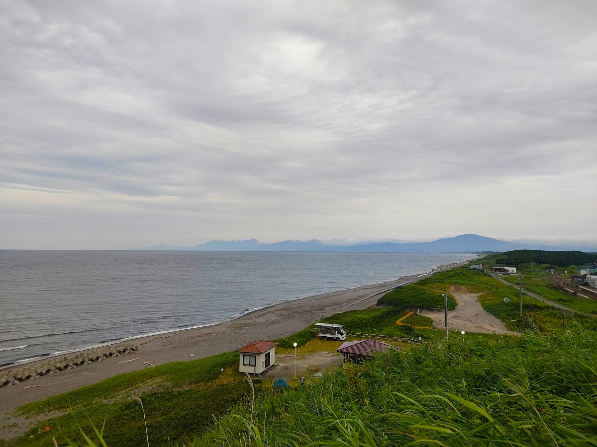 すぐ上の展望台に上ると、青の3号の向こうにうっすらと知床の山々が見えます。