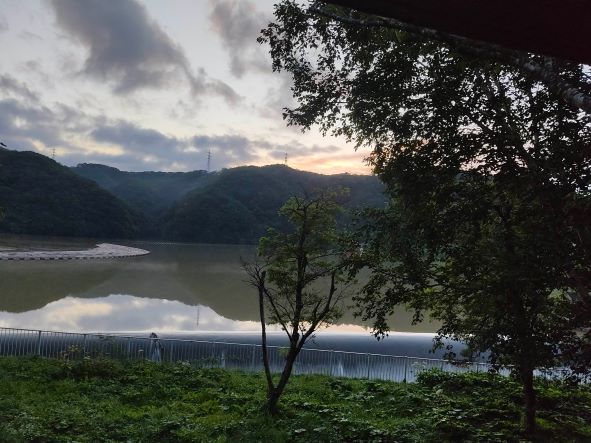 ブログをUPし、ドアを開けるとダム湖の水がだいぶ減ってきました。