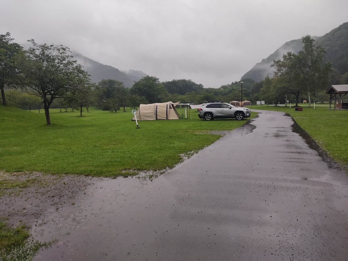 湯の沢水辺公園の夜が雨と共に更けていきます。