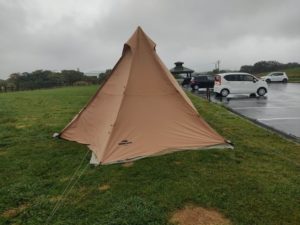 この一本ポールテントは建てるのは簡単なのですが、アンドレ・ザ・ジャイアントもくつろげるくらい…高さがあるので風に弱いような気がするのです。