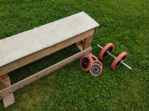 せっかくスポーツクラブに通い出して軌道に乗り始めたところなので、自作ベンチとダンベルを持ってきたのですよ。