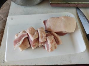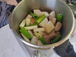 豚バラを切って、長ネギと大根を圧力鍋にいれて