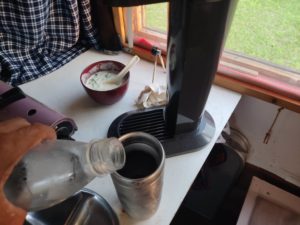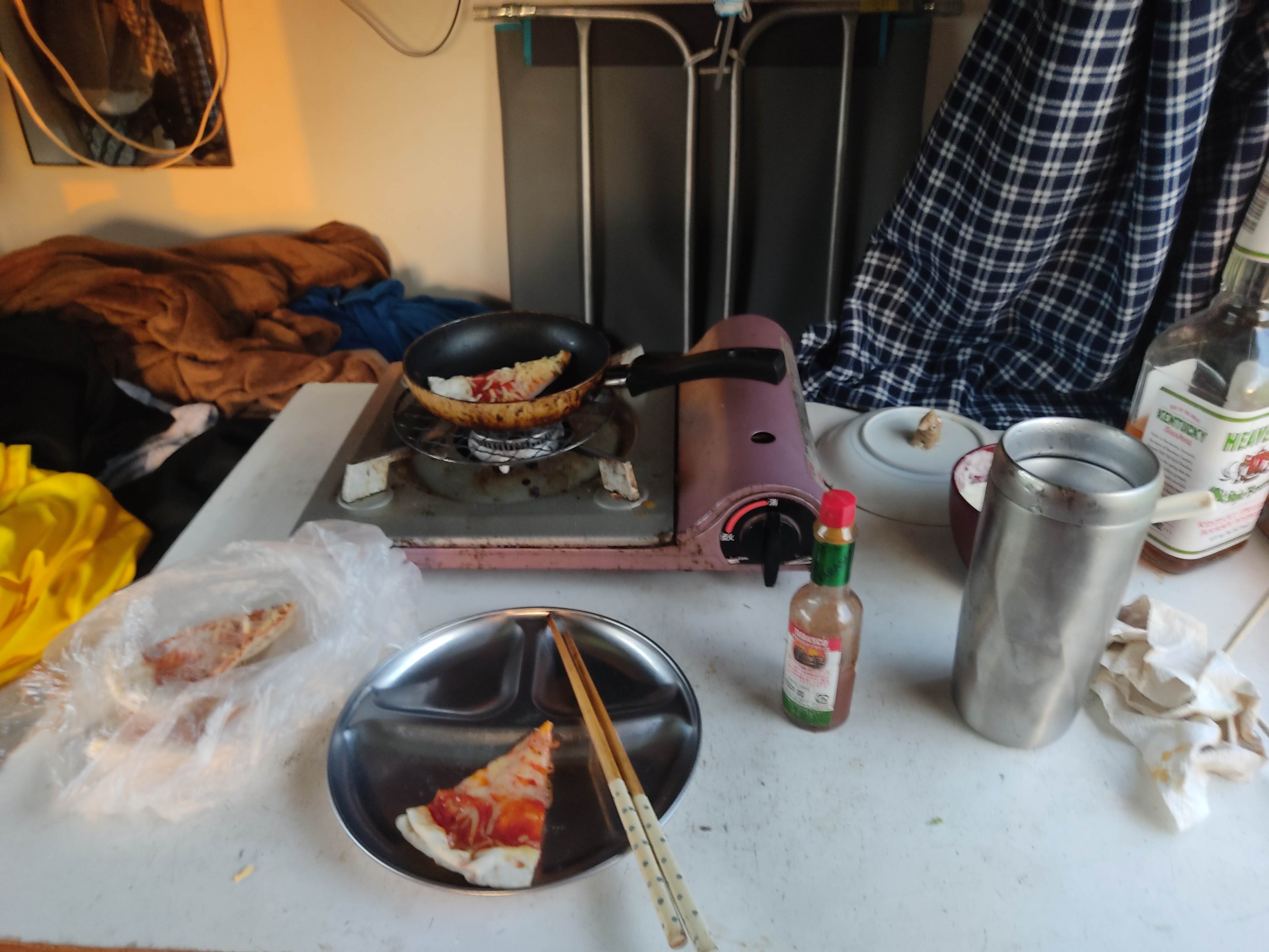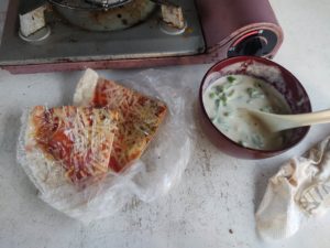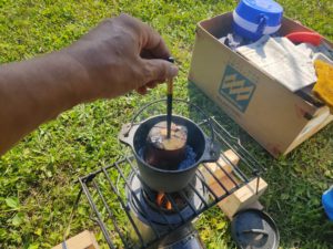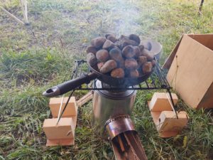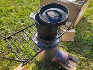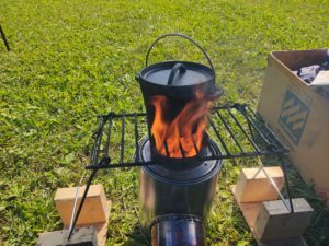 あとは、ロケットストーブ1号に火を入れて、その上に置くだけです。