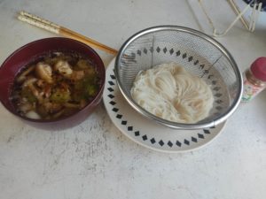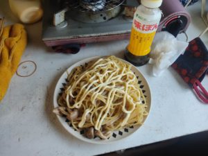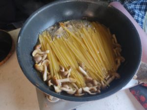 パスタを一旦茹でてお湯を捨る必要がなく、手間が省けガスの消費も少ないので車中泊者にとってはうってつけの料理方法ではないかと。