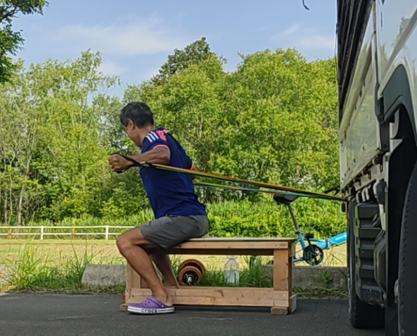 胸を鍛える重さのダンベルがないのでチューブトレです。