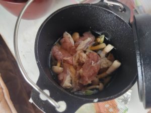 ダッチオーブンの中に、鶏肉、ネギ、キノコ、麵つゆを入れ