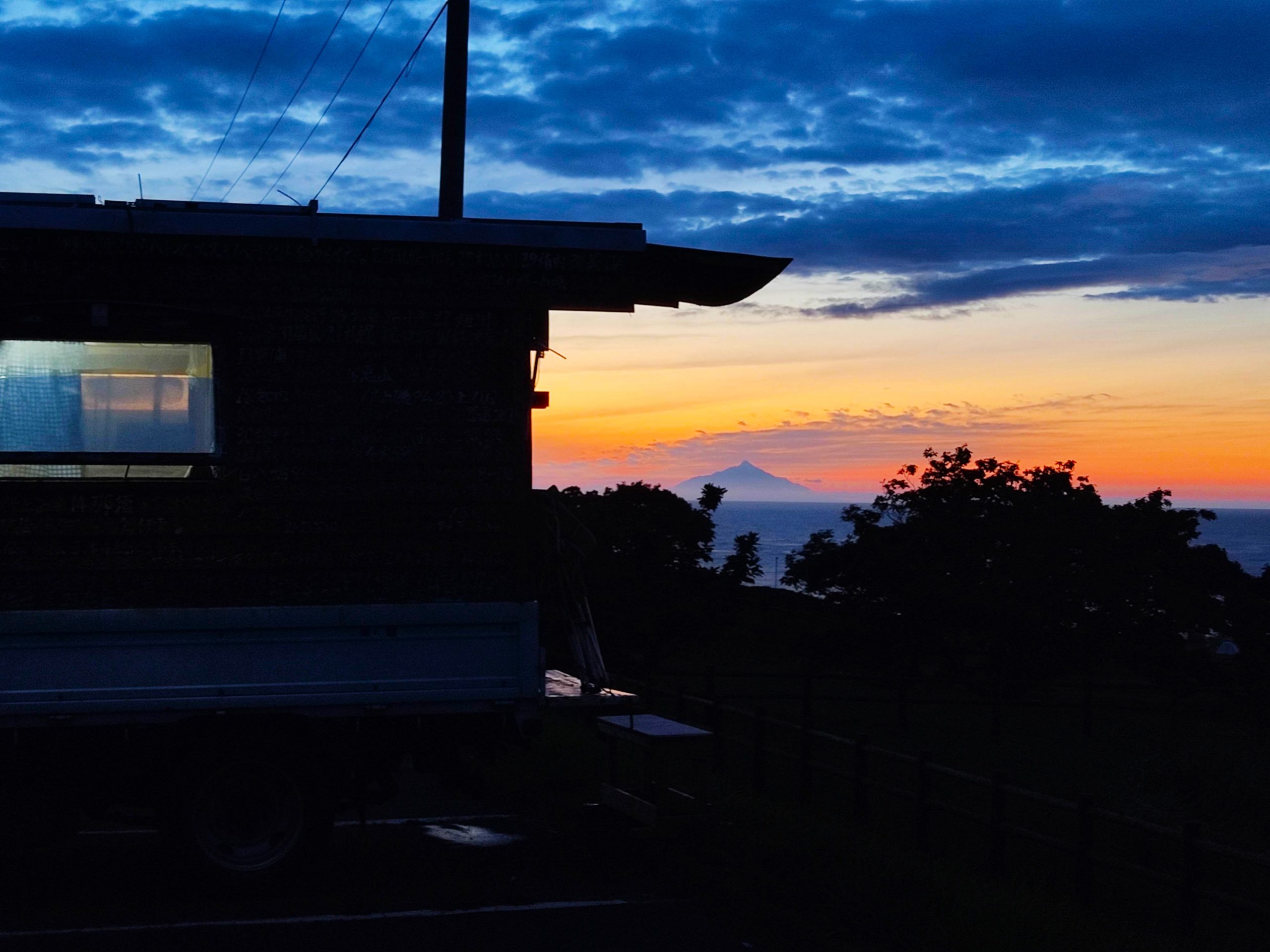 利尻島が夕焼けの空の中にぽっかりと浮かんでます。