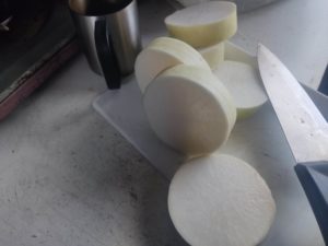 ダイコンを3等分に切り、そのひとつを2㎝幅の輪切りにします。