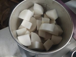 皮を剥いて十文字に切って鍋に入れて水と出汁を入れ、