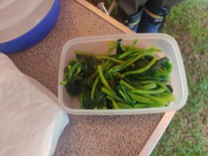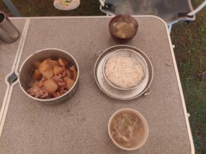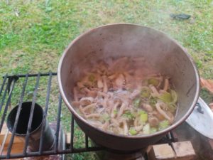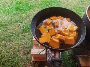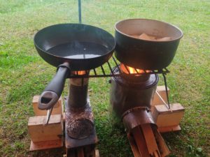 左側のフライパンでお湯を沸かしているロケットストーブ13号では、ほうれん草のお浸しを作ります。