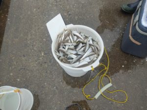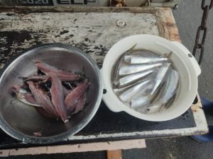 2. チカもそうですけど、イワシもサバも針から外す時は、釣竿を片手に、一番下の錘をもう一方の手に持って釣り糸を泉ピン子のように張らせて揺すると落ちて外れます。
