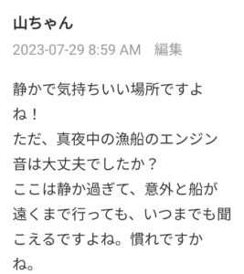 確かに漁船のエンジン音が聞こえるのですが、迷惑な車のアイドリング音とは違ってまったく気になりません。