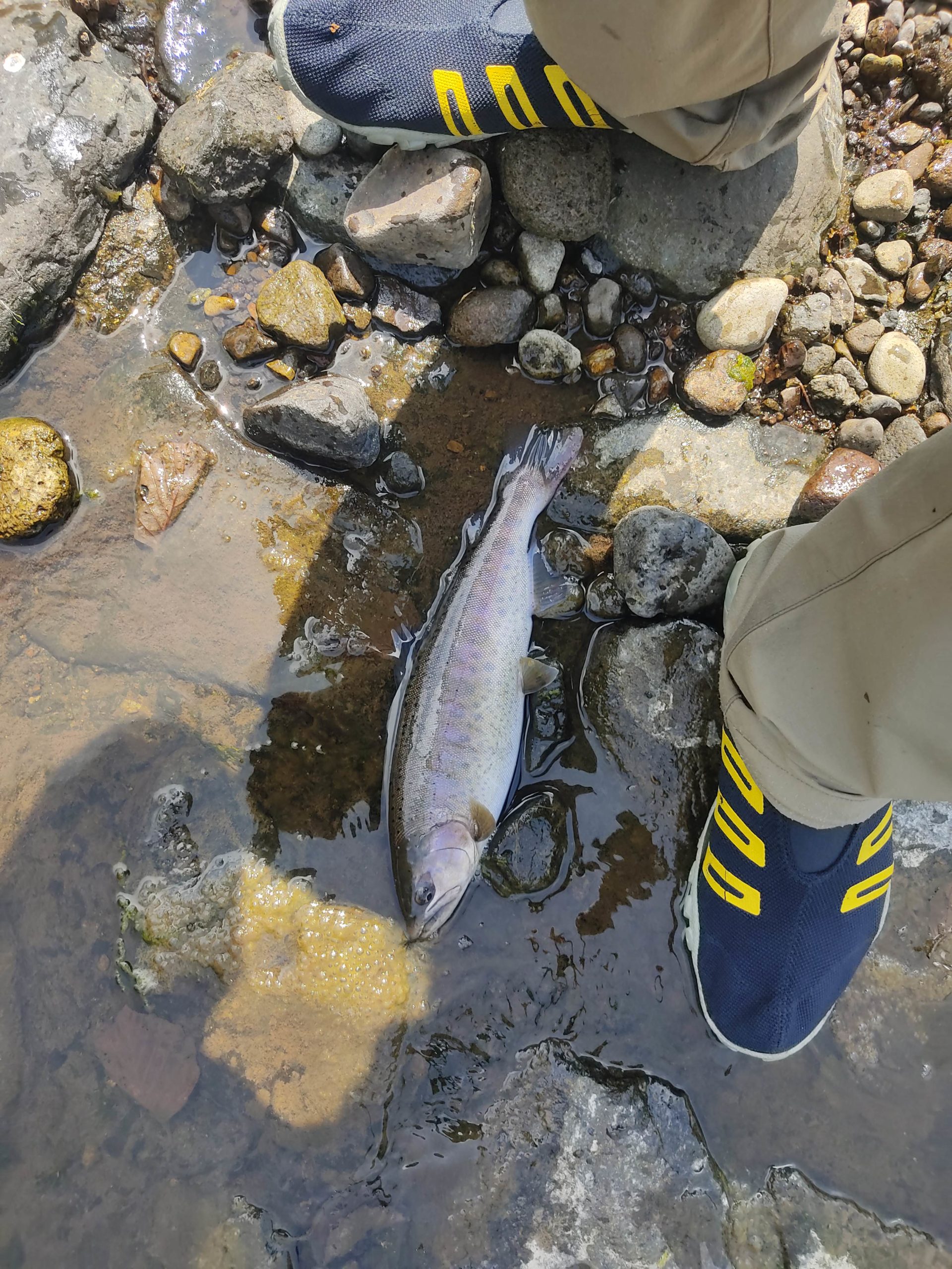 ニジマスは顔が丸いし斑点があるから、これは海で大きく育った降海型のヤマメ(サクラマス)と思います。