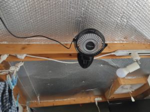 あまりに暑いので青の天井に今年初めての扇風機を取り付けました。