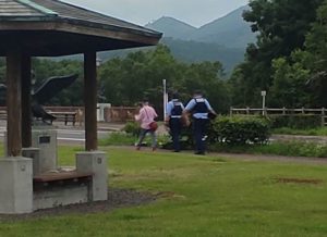 おじさんがおまわりさんを連れて川の方に歩いていきます。