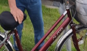 外に出てみると、自転車に乗ったおとうさん(78)が佇んでます。
