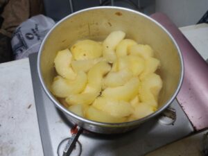 皮を剥き、芯を取って鍋に入れ、砂糖とレモン汁を入れて