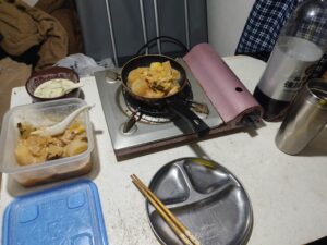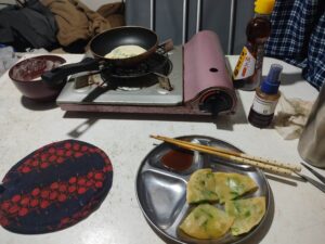夕食は作り置きの鶏肉と大根とじゃがいもの煮つけ、そしてチヂミです。