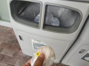 ちなみに、ここは燃えるゴミ箱もあるので、他の包装類、ビニール類は捨てていきます。