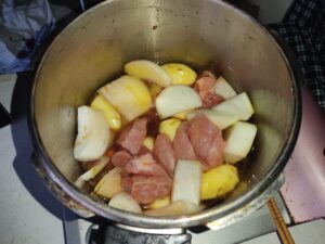 じゃがいもの皮を剥き、玉ネギを切り、豚ロースを一口大に切って圧力鍋に入れて、醤油、砂糖、みりん、酒を加えて