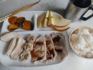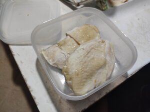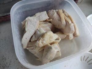 冷蔵庫で冷やしていた鶏むね肉を切ってタッパーに入れ
