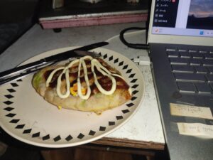 冷蔵庫に入れておいた余ったお好み焼きを温めなおして食べながら