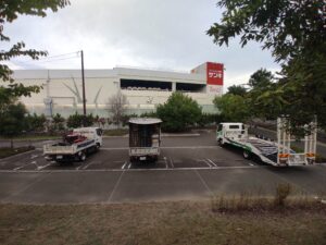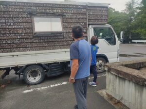 右のトラックはエンジンかけっぱなしでオヤジがグースカ寝てるし。
