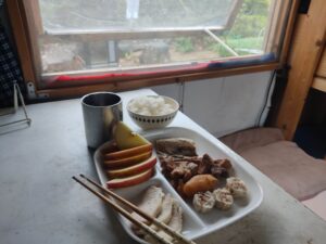 出発前に向こうを見ると、昨夜高校生たちがお茶会をしていた東屋で、