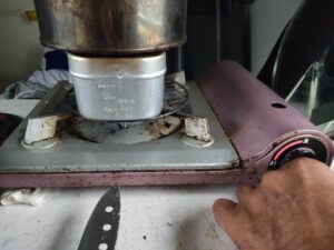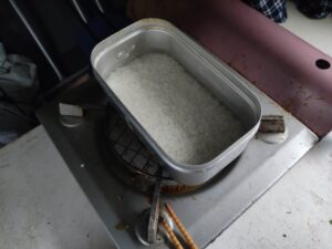 昨日の夕方にコメを水に浸しておいたメスティンをコンロに乗せ、