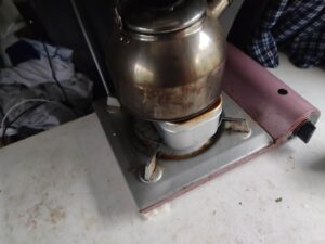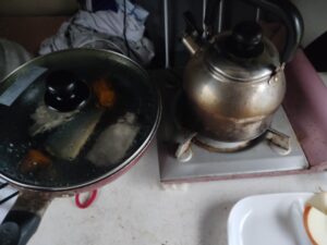 みそ汁用の水を入れたやかんをその上に置いて火を点けます。